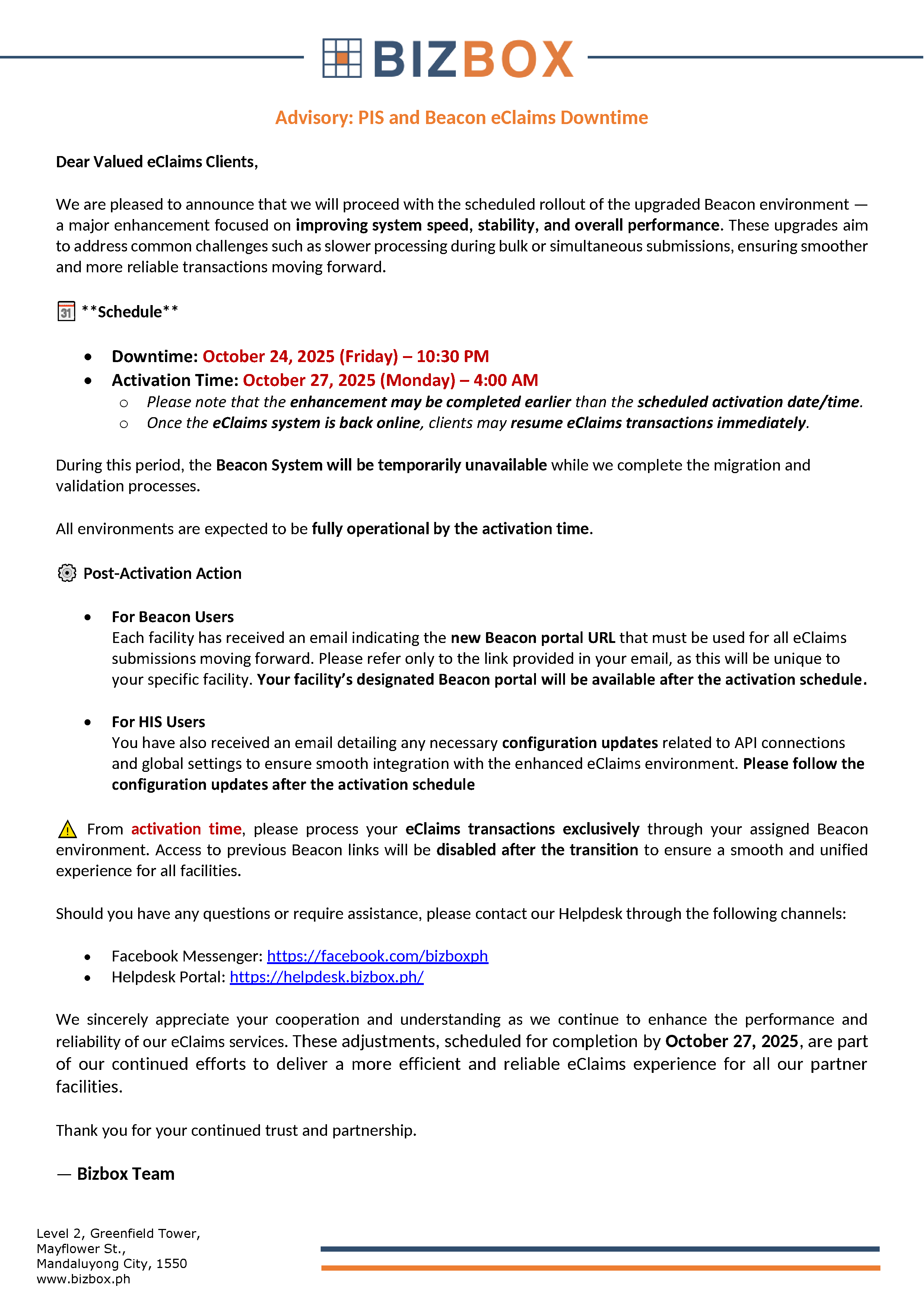 We sincerely appreciate your cooperation and understanding as we continue to enhance the performance and reliability of our eClaims services. These adjustments, scheduled for completion by October 27, 2025, are part of our continued efforts to deliver a more efficient and reliable eClaims experience for all our partner facilities.