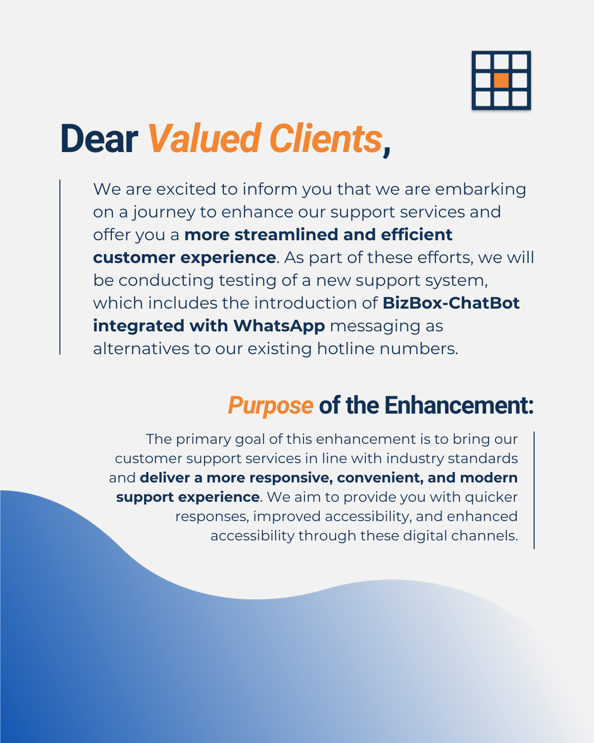 We are excited to inform you that we are embarking on a journey to enhance our support services and offer you a more streamlined and efficient customer experience. As part of these efforts, we will be conducting testing of a new support system, which includes the introduction of BizBox-ChatBot integrated with WhatsApp messaging as alternatives to our existing hotline numbers.