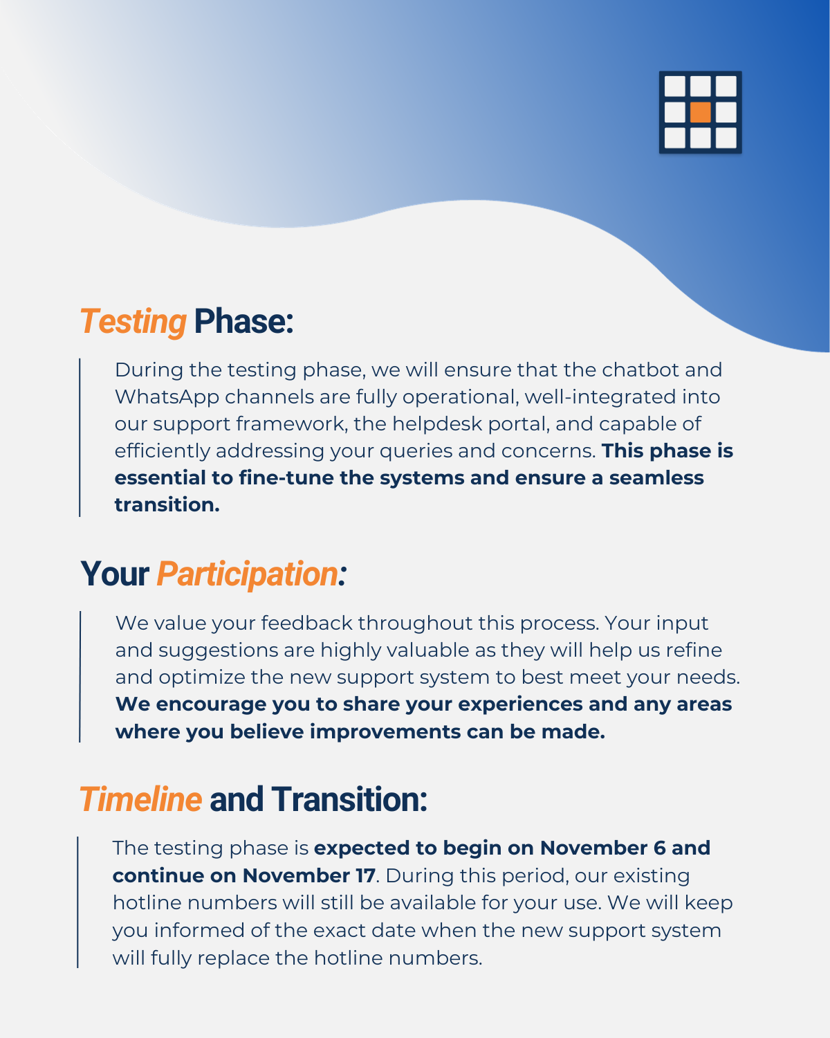The testing phase is expected to begin on November 6 and continue on November 17. During this period, our existing hotline numbers will still be available for your use. We will keep you informed of the exact date when the new support system will fully replace the hotline numbers.
