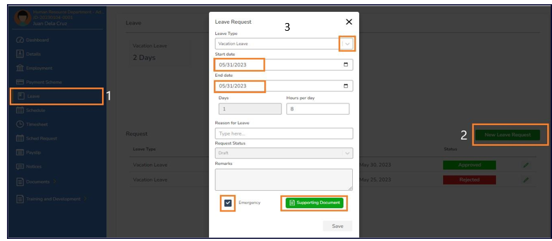Note: Employees can only file schedule requests to dates that are plotted to them 1. On the leftmost part of Employee module, select Sched Request, Add New Request and select the type of your request in the drop-down list - Absent, Half day, ...