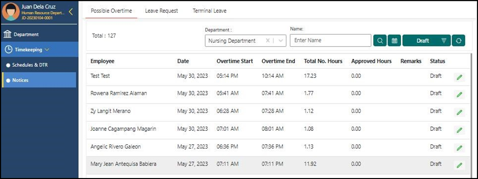 and go to Possible Overtime. Here, you can see the list of employees who have possible overtime
