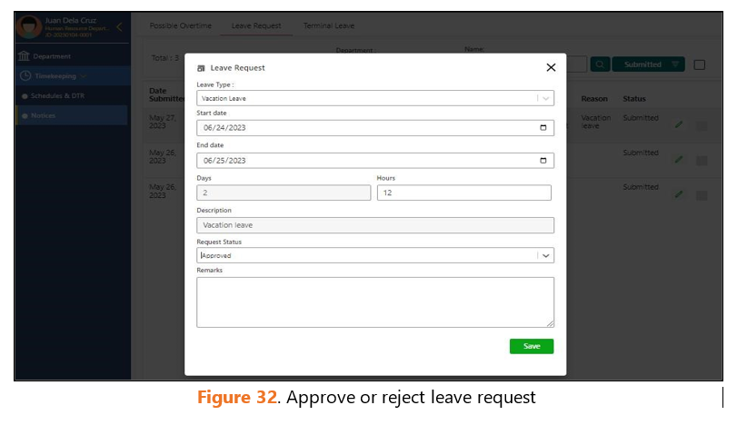 the request status as "Approved" and save the changes by clicking the save button. Conversely, if you want to decline the leave request, set the