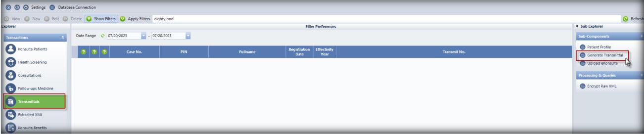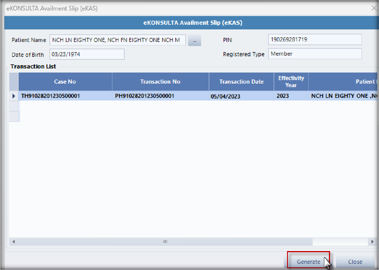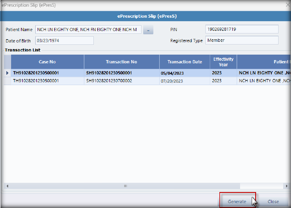5. After selecting patient, the system will load the Health Screening and Consultation list of patient. Click on generate to load the details of the selected transactions.