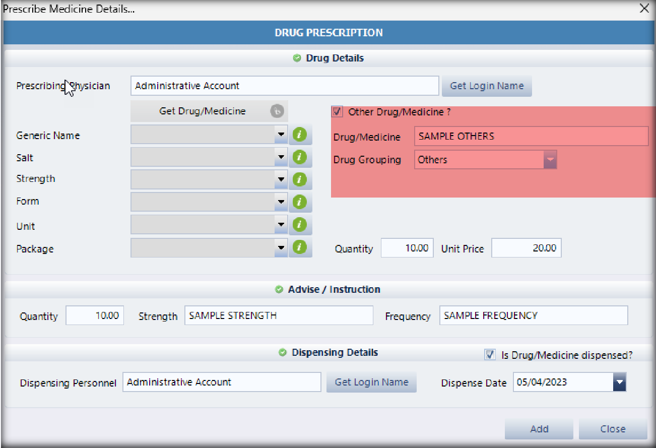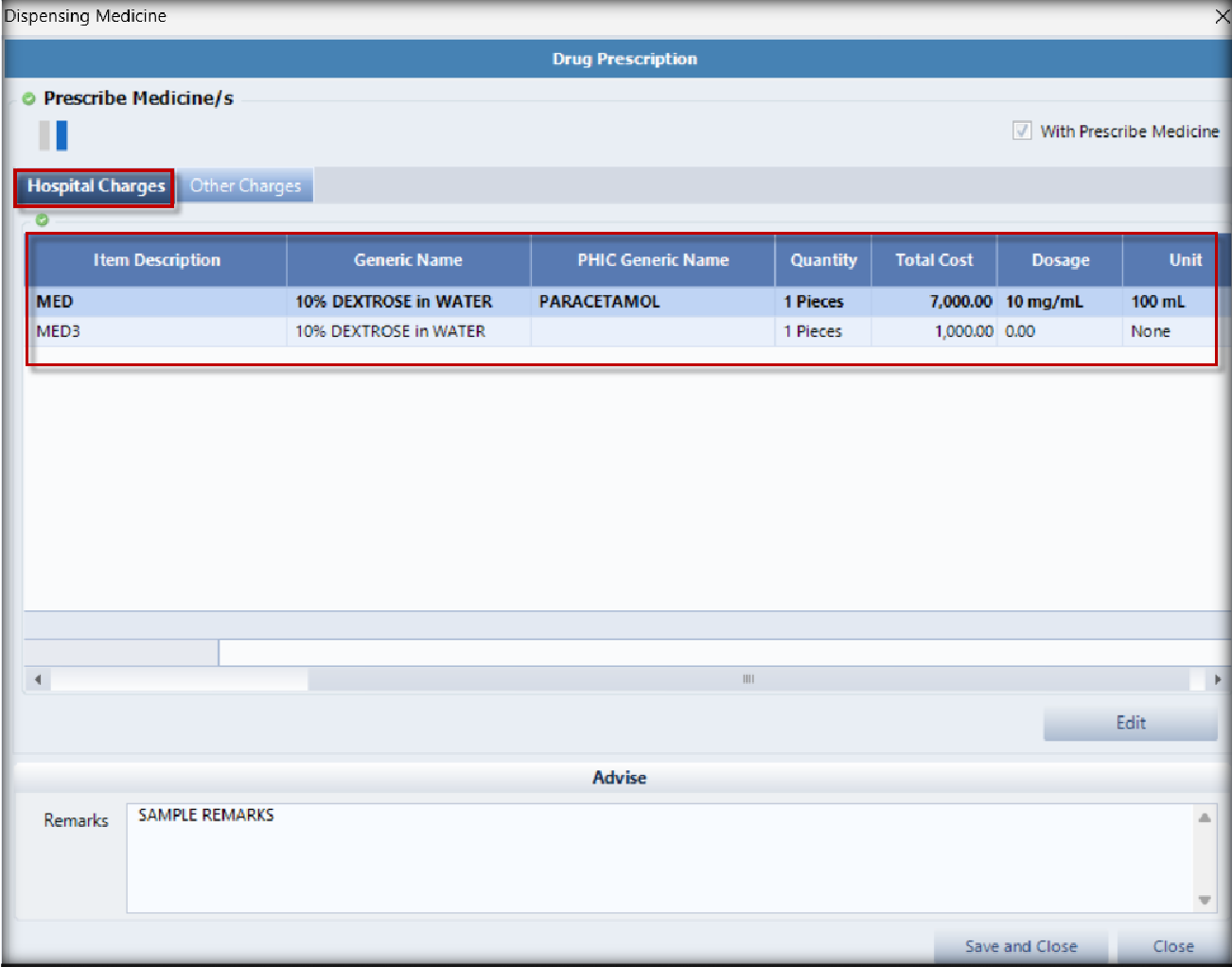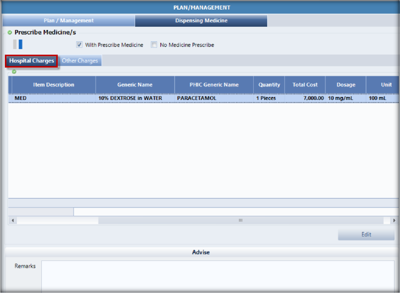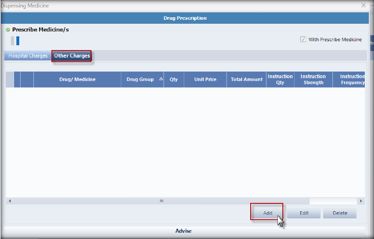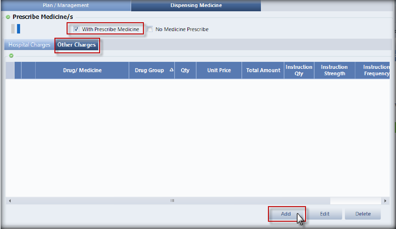 15. If in case the user would like to add Outside Charges, you may proceed to Other Charges and add medicine charges. Please follow the discussion in Consultation – Plan/Management – Dispensing Medicine.