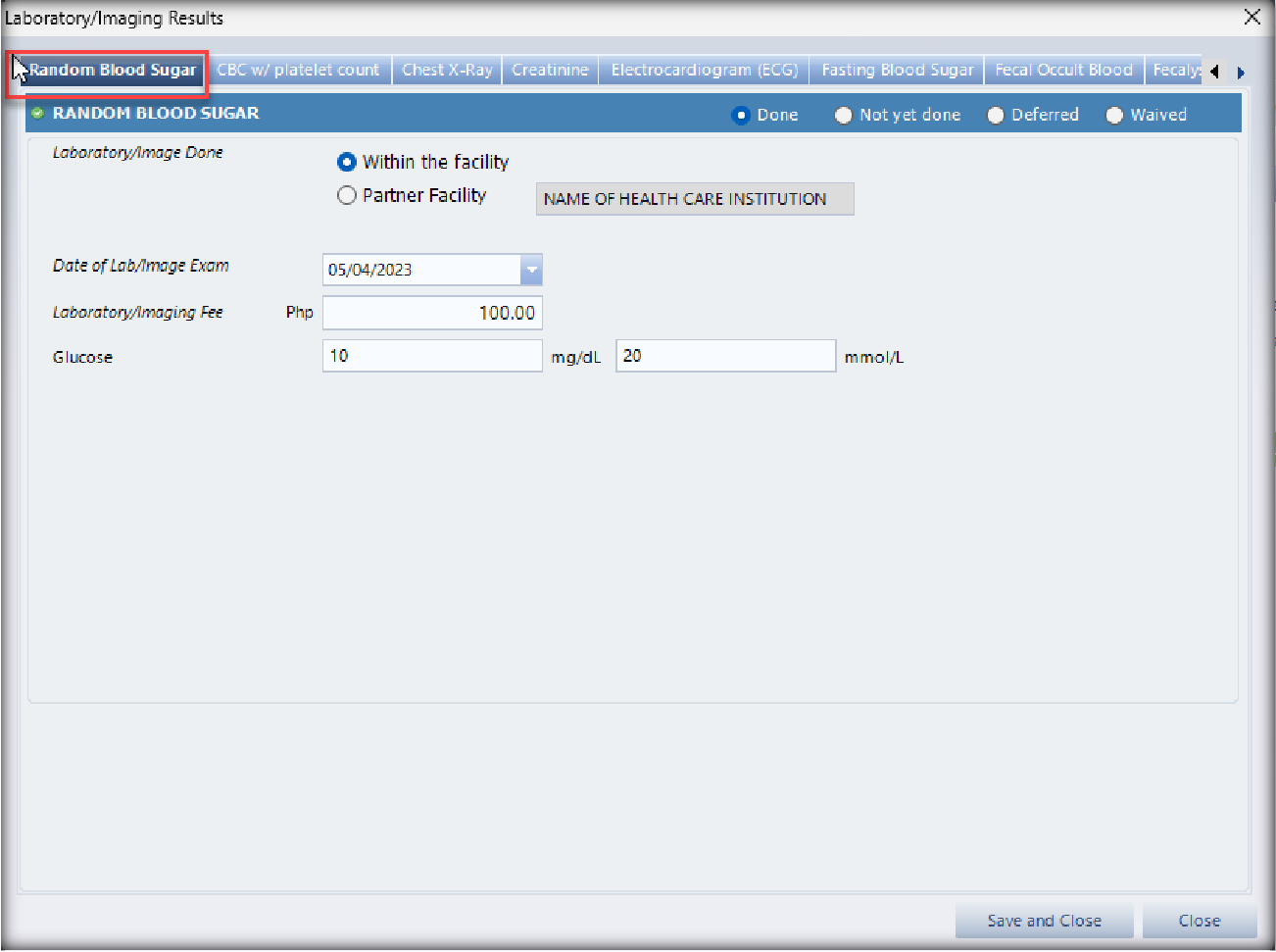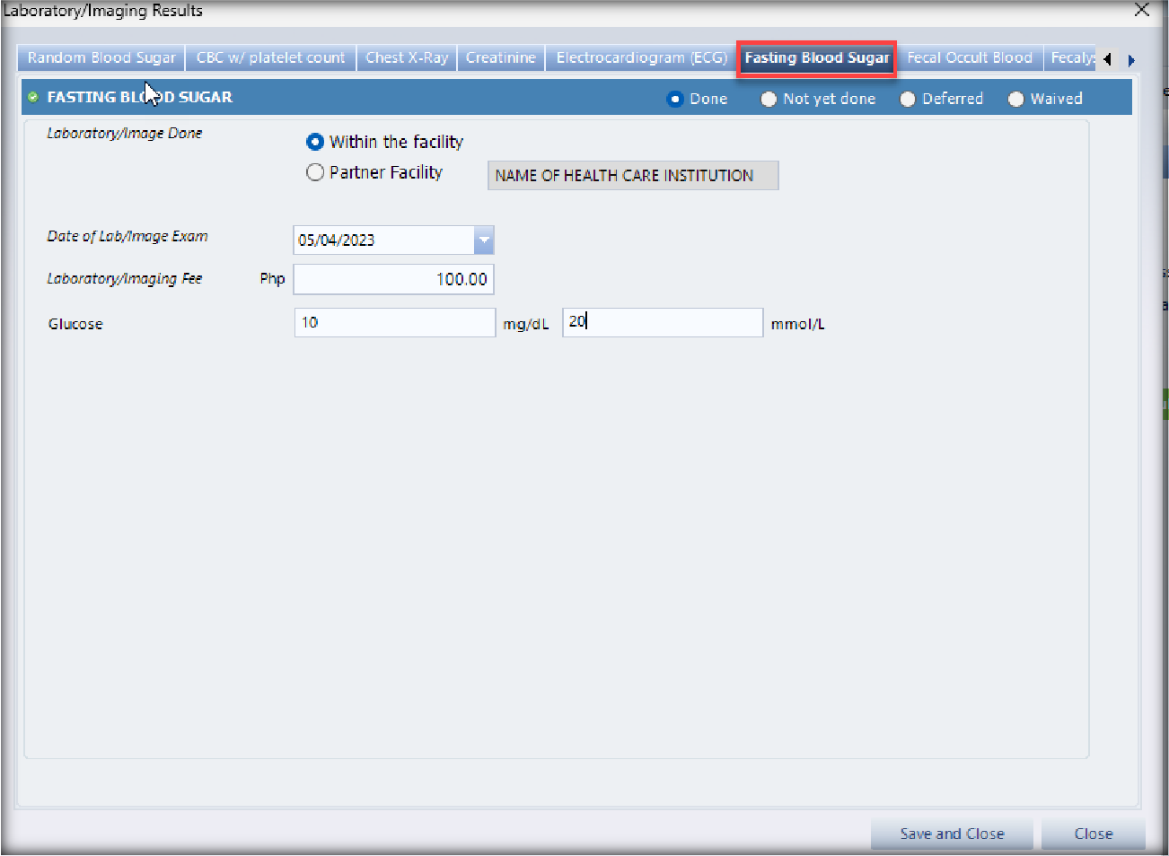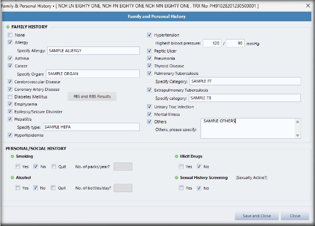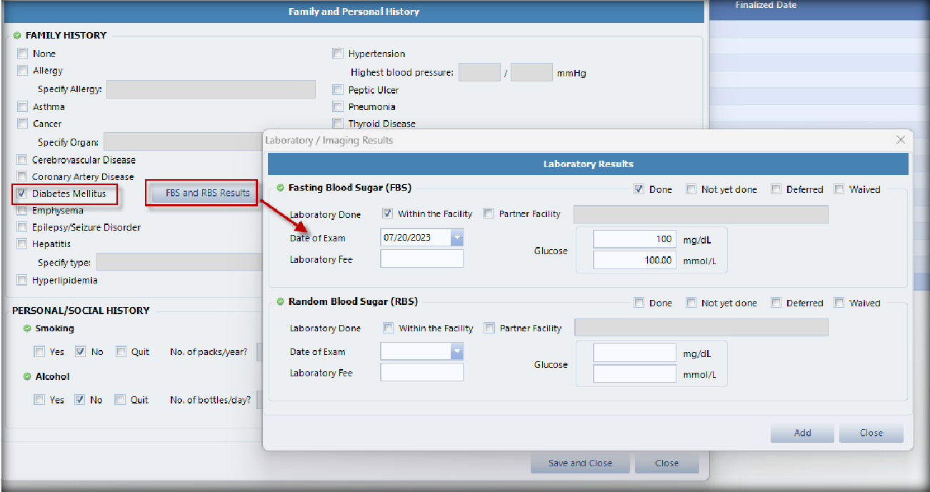 In Family and Personal History module, when clicking Diabetes Mellitus, the user may encode the Fast Blood Sugar (FBS) or Random Blood Sugar (RBS) of patient