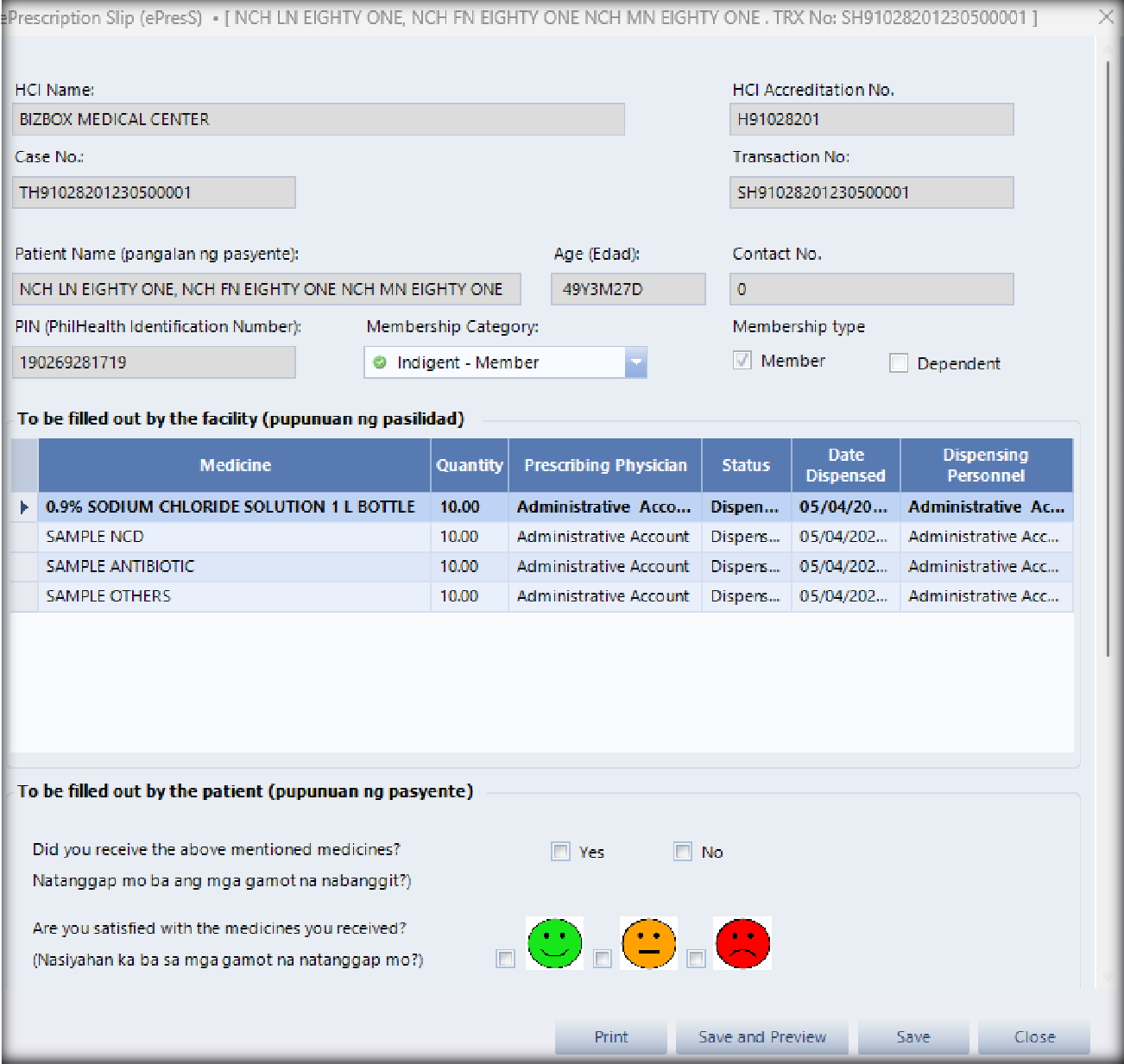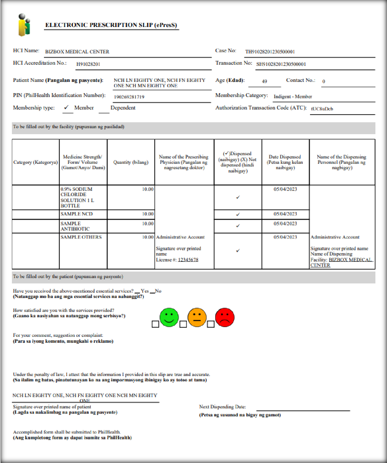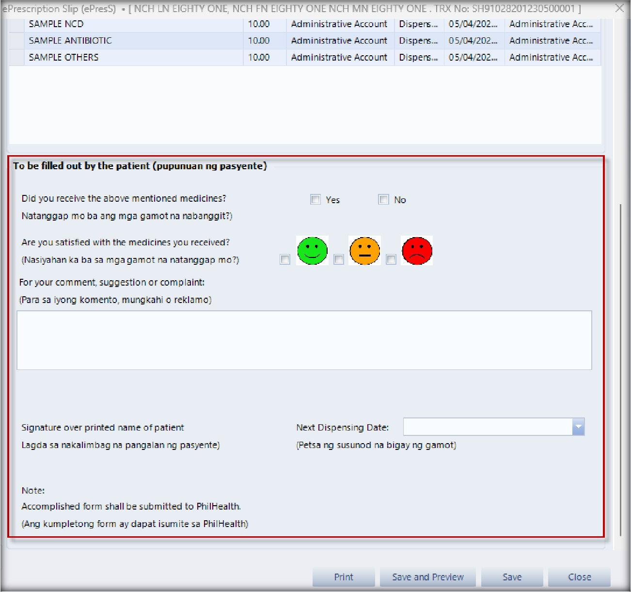 6. After clicking the Generate button, the system will load the details of ePrescription Slip. The user may input on the “To be filled out by the patient (pupunan ng pasyente).