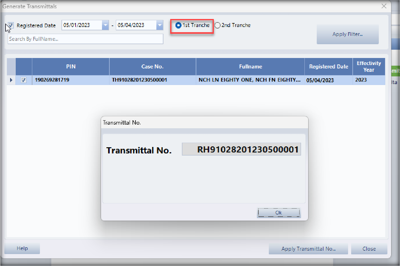 GENERATE TRANSMITTAL FOR FIRST TRANCHE