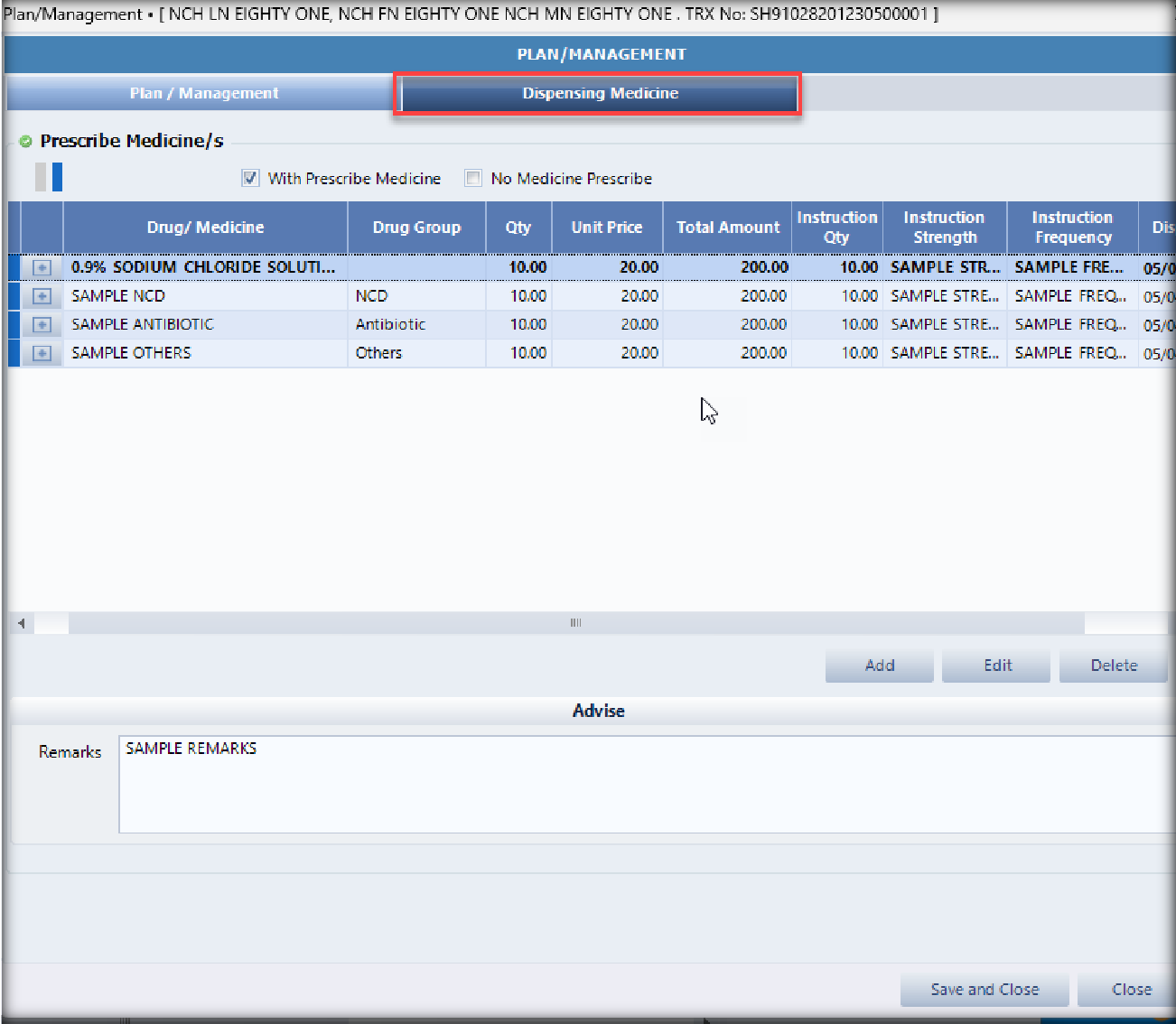 5. After selecting patient, the system will load the Plan/Management – Dispensing Medicines and Follow up Medicine list of patient. Click on generate to load the details of the selected transactions.