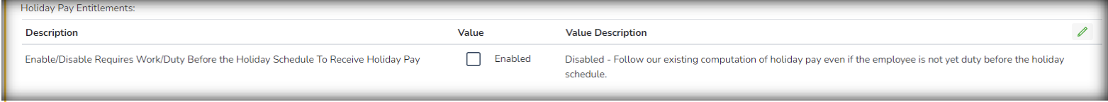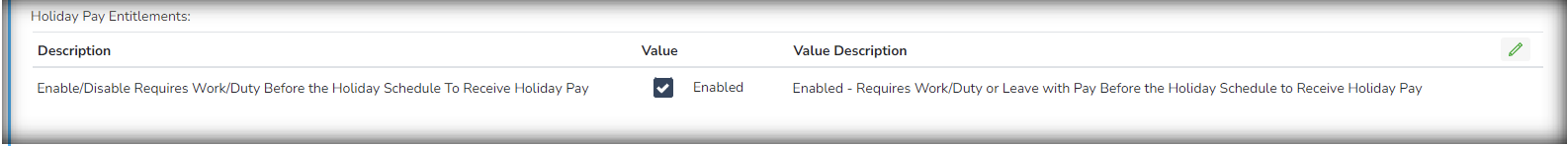 A new feature and setup for enabling and disabling the holiday pay. Option: Default (Enabled)