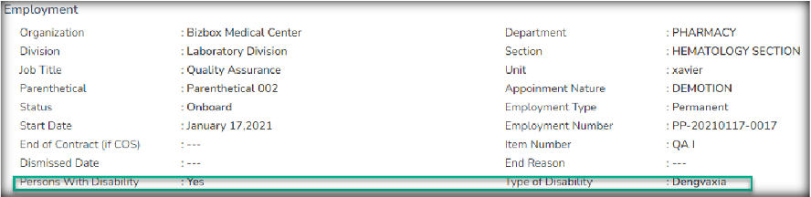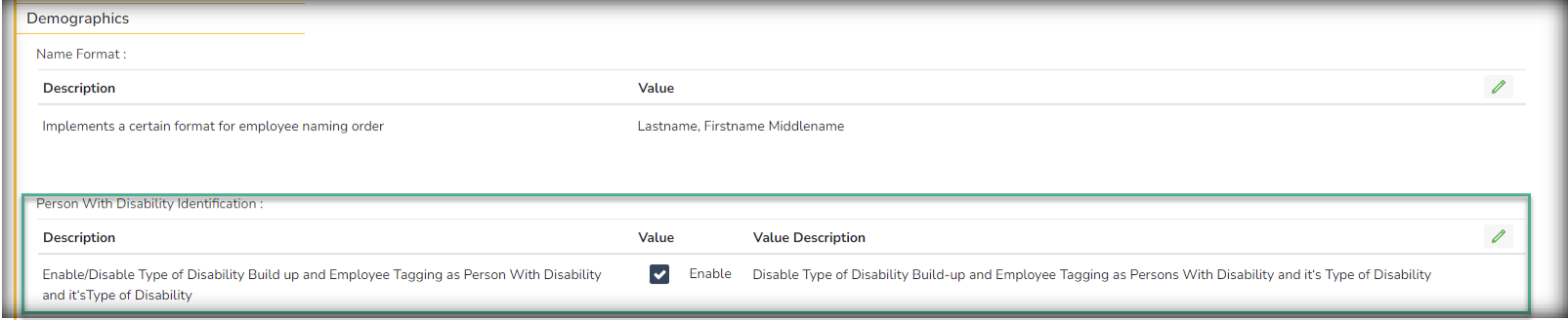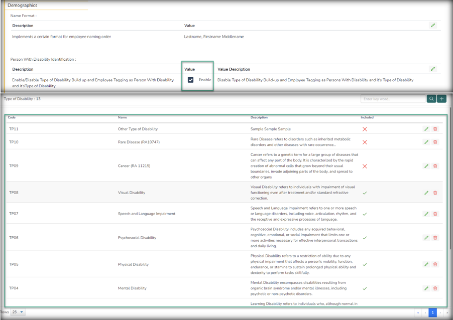 System Setup - Setup and Options - Demographics – Persons with Disability Identification To be able to create setup for Type of Disability and Employee Tagging as Persons with Disability and its corresponding type of Disability.