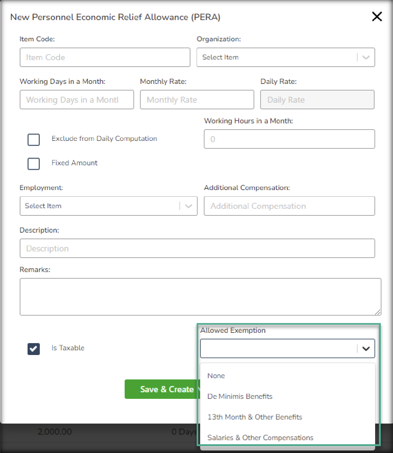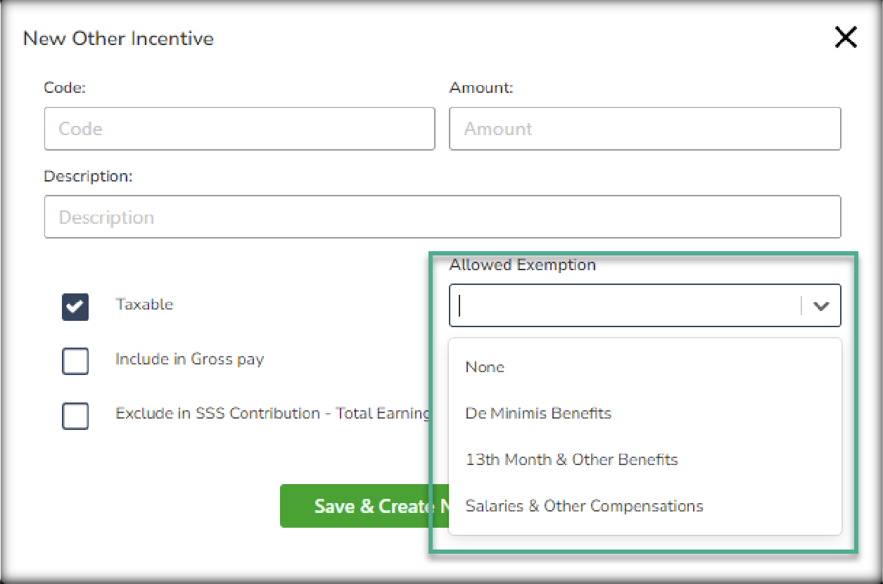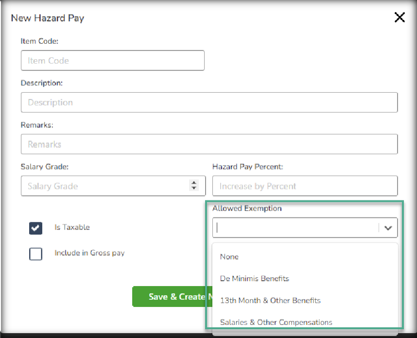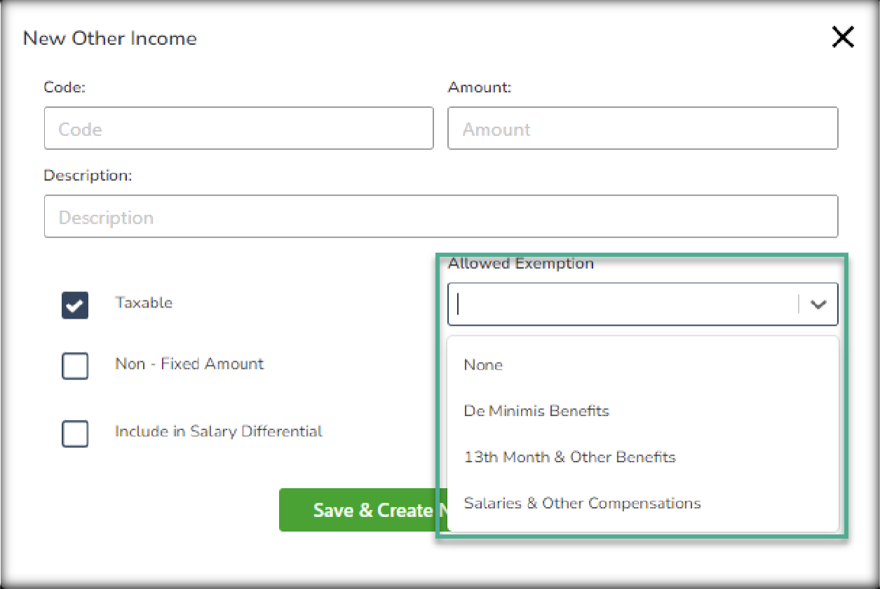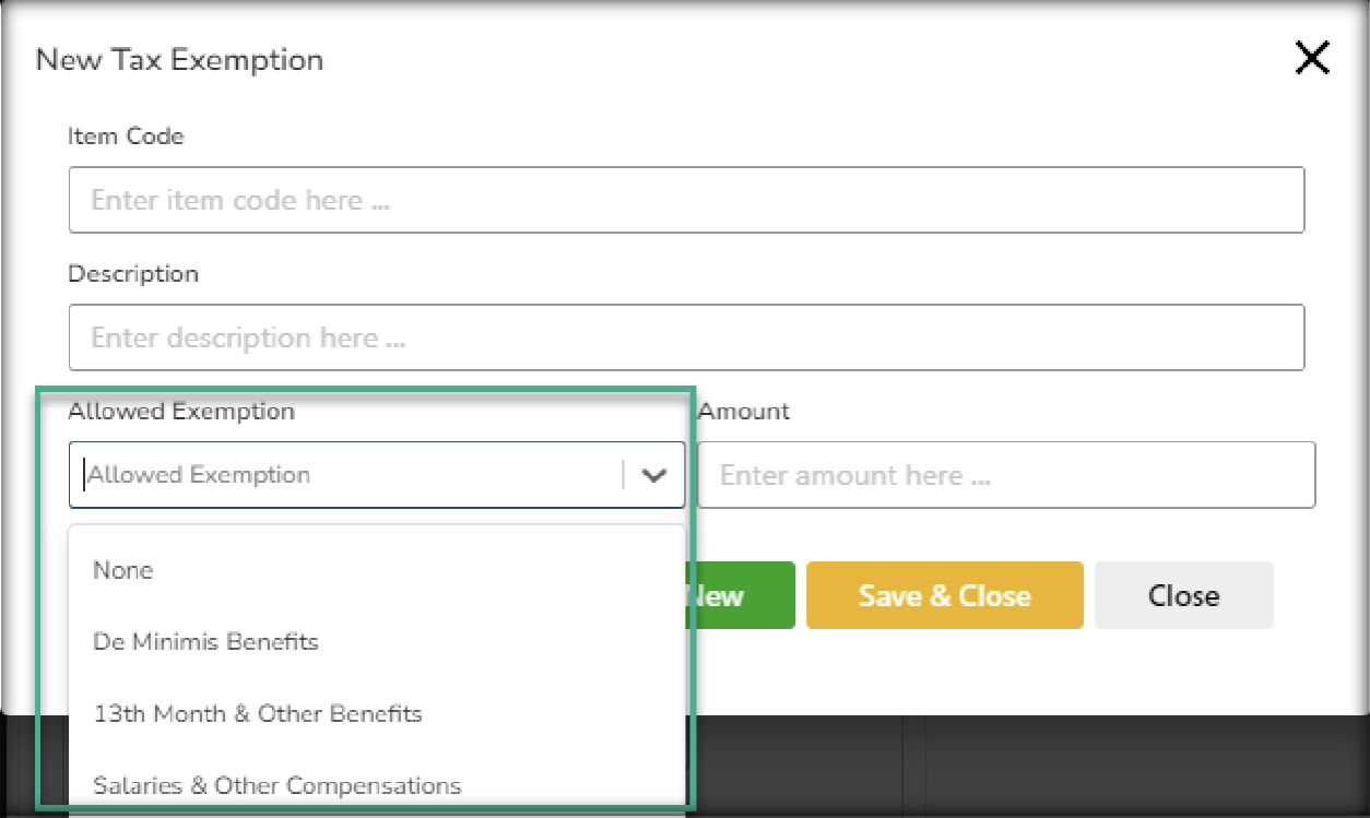 The Allowed Exemption option for Tax Exemption buildup is now presented as a dropdown, allowing users to choose between None, De Minimis Benefits, 13th Month & Other Benefits, or Salaries & Other Compensations.