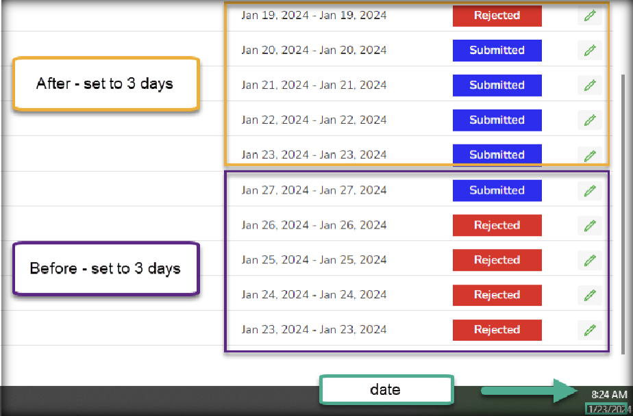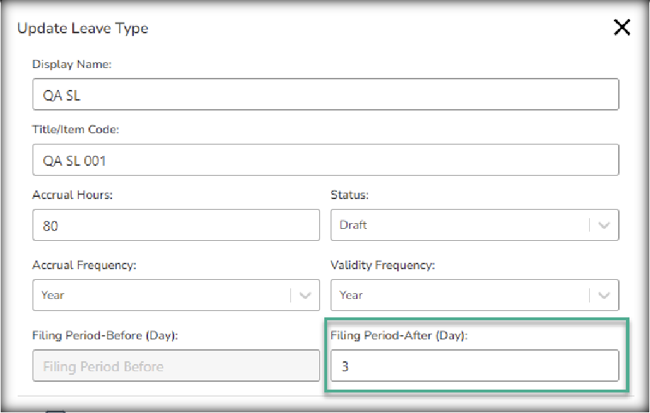 New field in Leave, Filing Period-After (Day). This filing period will serve as the window during which the employee can still submit a leave request even after the leave has been committed.