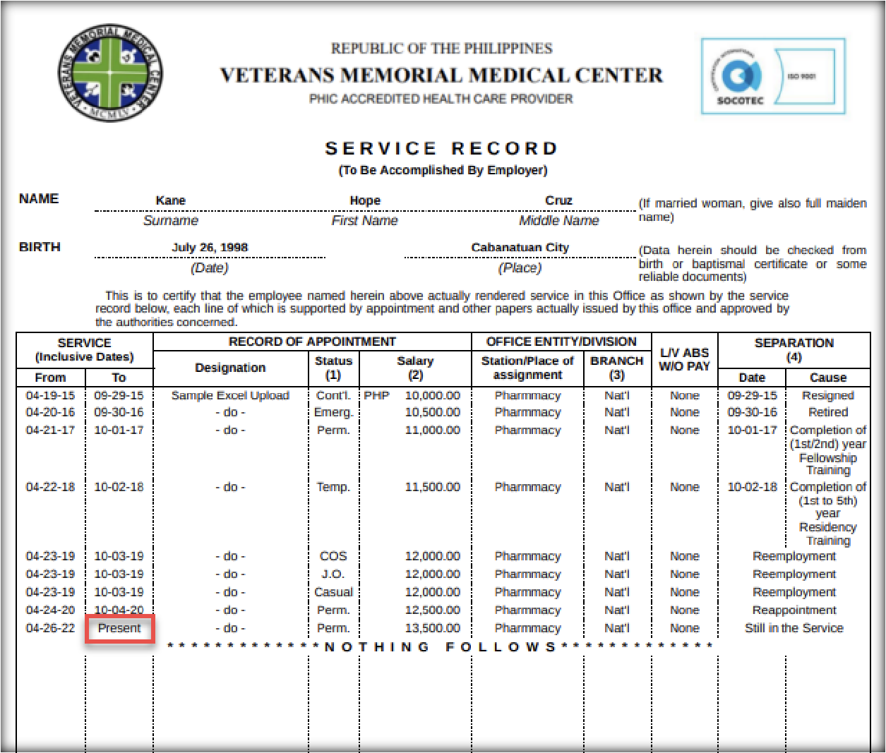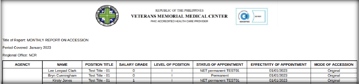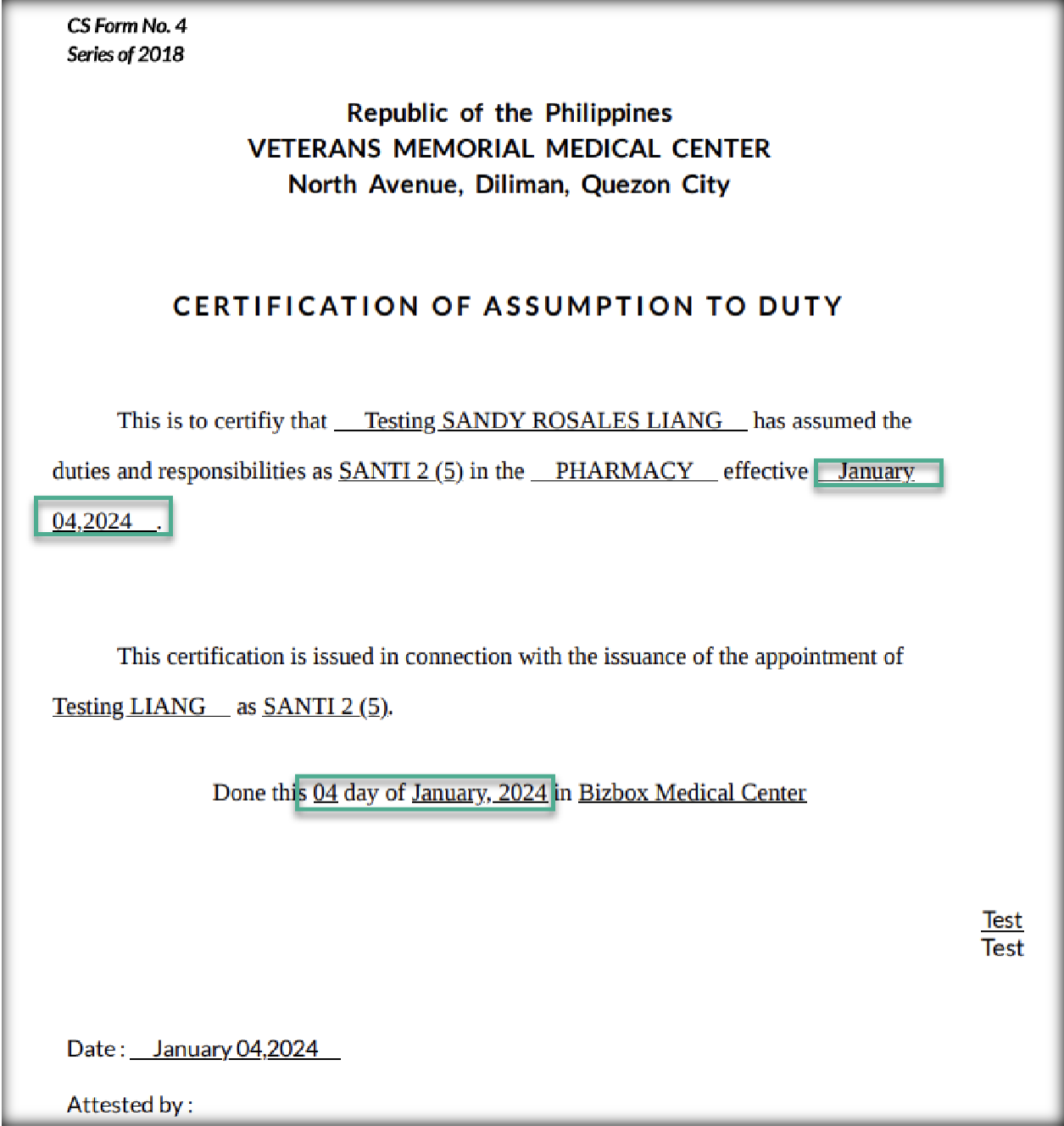 Employee Profile – Reports – Certificate of Assumption to Duty
