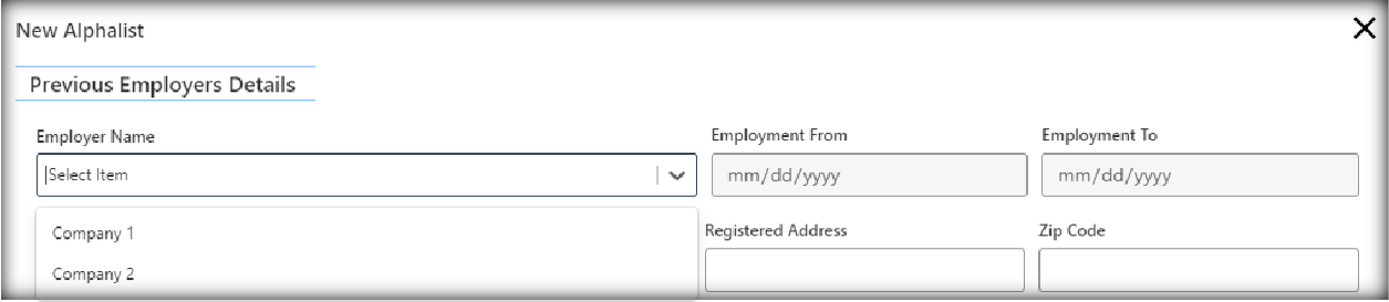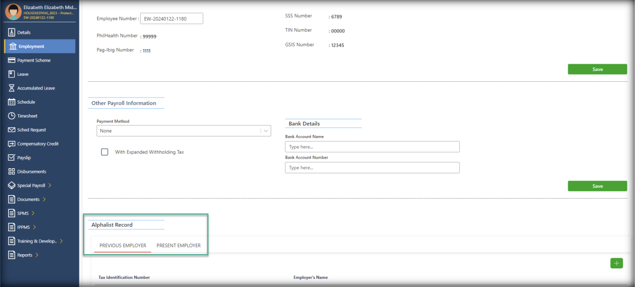 A new section in the Employment, Alphalist Record, where the users can input details for Previous and/or Present Employer.