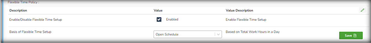 A new feature and setup for enabling/disabling the flexible time policy in the HRP Employee profile for tagging the employee.