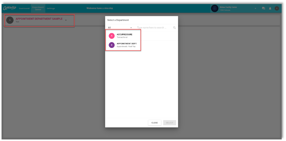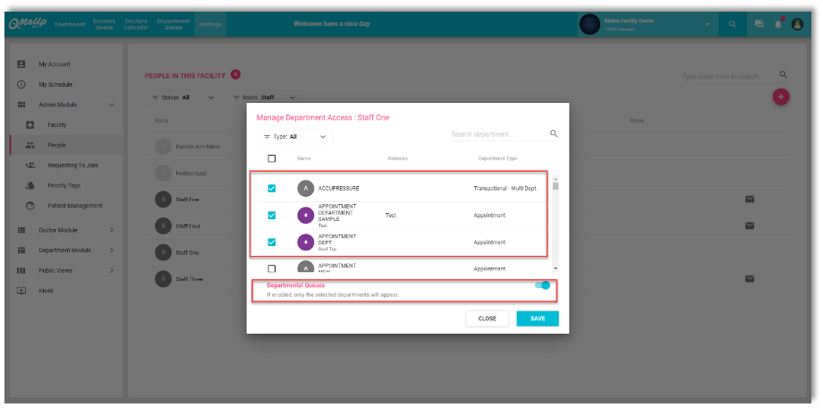 For this feature, we included a new button upon assigning a department to a staff member, and upon selecting assign department, you can select the department you want to assign, then click the department queue and assign department will appear only.
