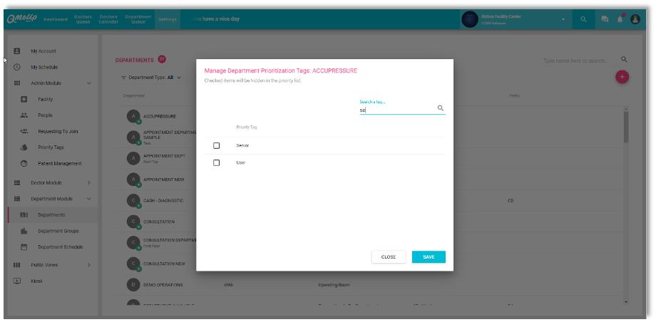 QMU Facility - Settings Module - Enhancement for Searching Priority Tags on Department