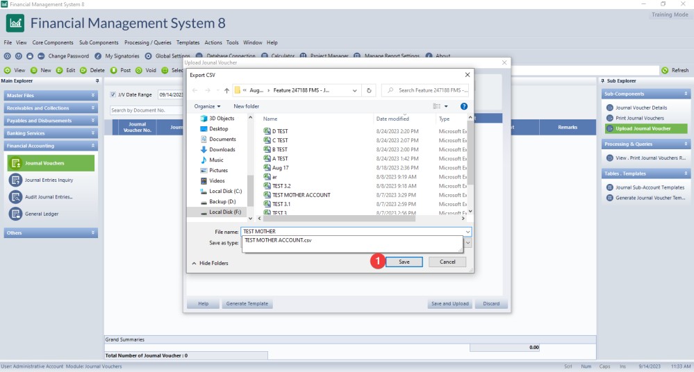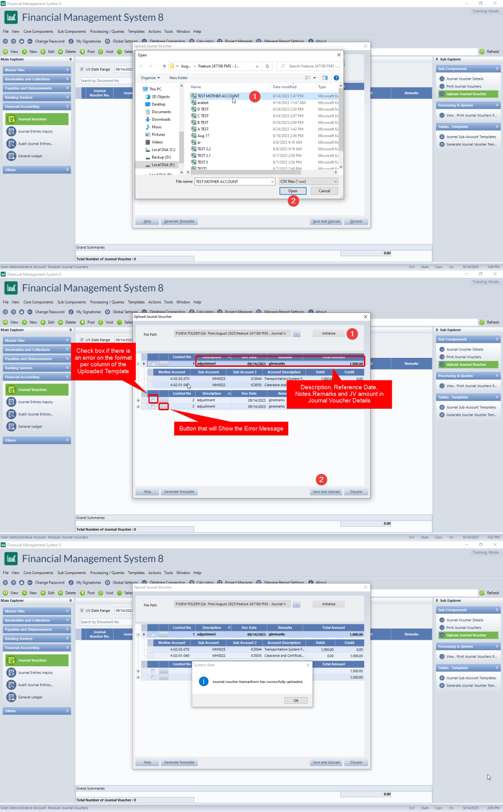 - Upload the .CSV template. AFTER SEEING THE “Journal Voucher Transactions has successfully uploaded” MESSAGE PROMPT CLICK OK TO CLOSE THE MESSAGE PROMPT.