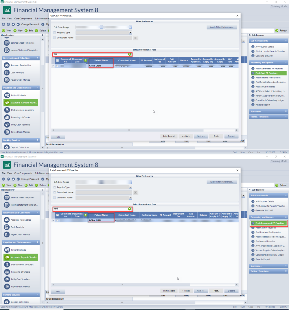 To add a new filtering option for patient names when processing 'Post Cash Professional Fee Payables' and 'Post Guaranteed Professional Fee Payables'