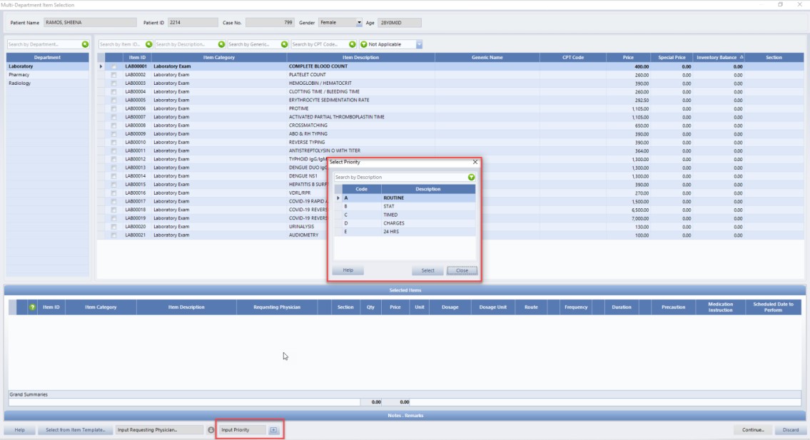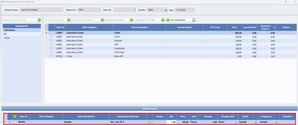 4. Choose the Department, followed by selecting Items for batch charging. Please be aware that the displayed price will not be shown, as it will depend on the patient's price scheme and price group, potentially resulting in price variations.