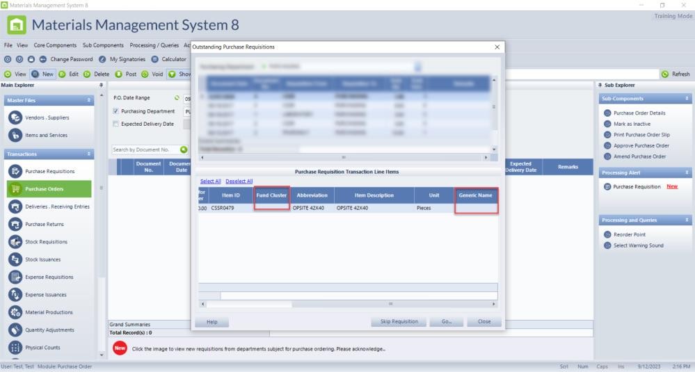 Adding a new "Fund Cluster" column in the Purchase Order module. The Fund Cluster information will be entered next to the Item ID, while the generic name will be moved to the last column