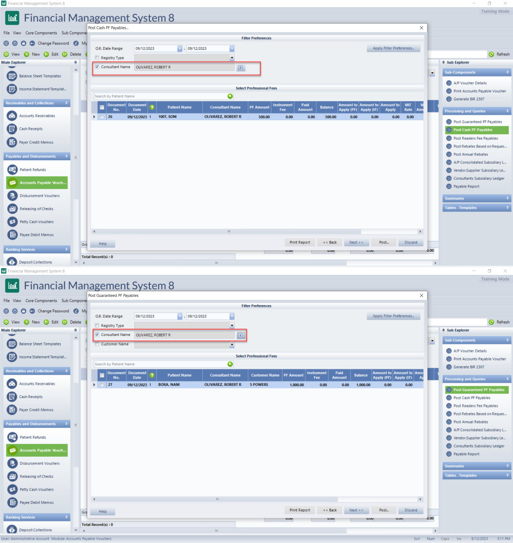 1. Adding a new patient name filtering option after generating results in Post Cash Professional Fee Payables. It will automatically search for patient names as you type, eliminating the need to press enter or click "Apply Filter." Selected transactions will not be discarded when searching for another patient