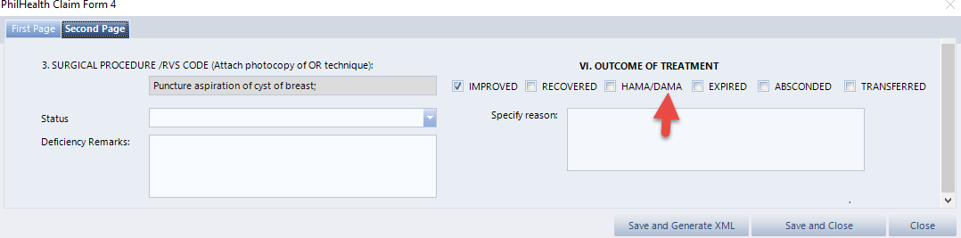 Add the DAMA disposition in the Claim Form 4 Processing > VI. Outcome Of Treatment