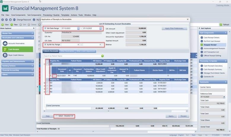 To add a new "Select/Deselect All" feature when processing reapplication of Cash receipts while using the filtering option for the Bill Date number range and/or Bill Date Range