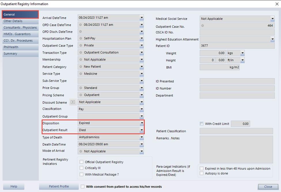 The users can now view the Disposition and Outpatient Result in the Outpatient Registry Details.