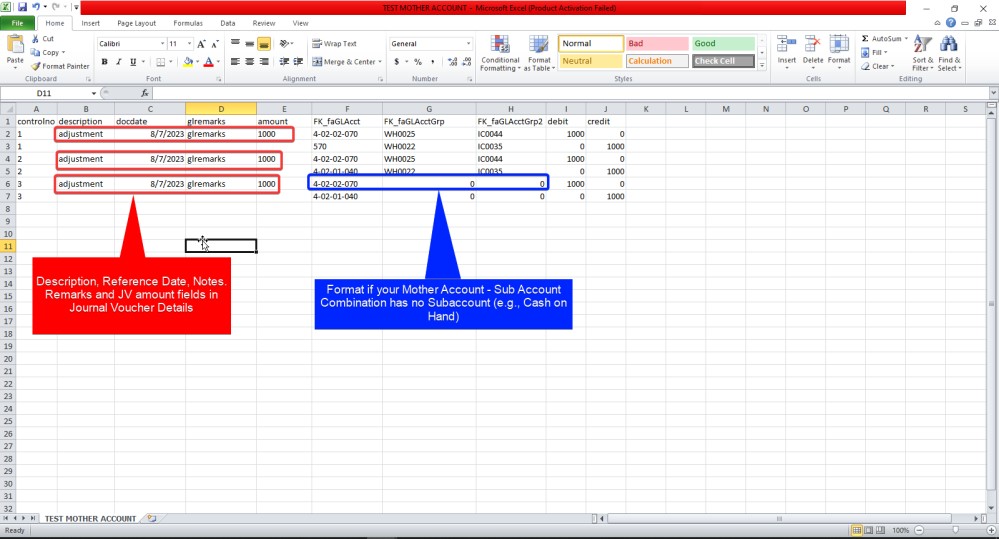 - Edit your .CSV Template to create your desire Journal Voucher.