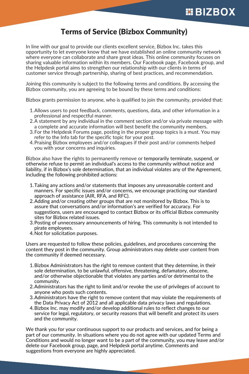 In line with our goal to provide our clients excellent service, Bizbox Inc. takes this opportunity to let everyone know that we have established an online community network where everyone can collaborate and share great ideas. This online community focuses on sharing valuable information within its members. Our Facebook page, Facebook group, and the Helpdesk portal aims to strengthen our relationship with our clients in terms of customer service through partnership, sharing of best practices, and recommendation.