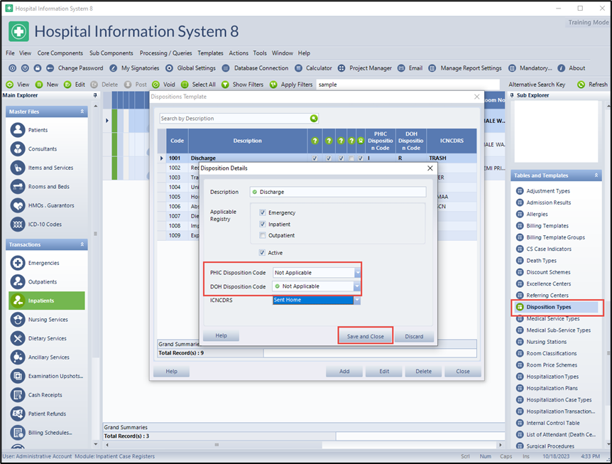 (HIS), then access the 'Inpatient Module' and proceed to 'Disposition Types.'
