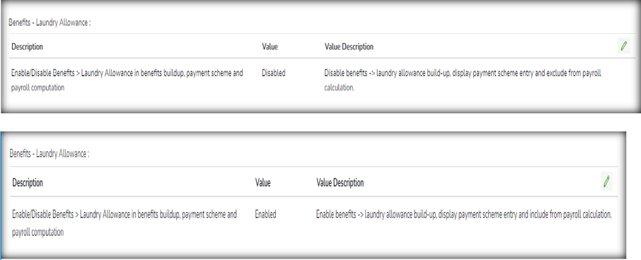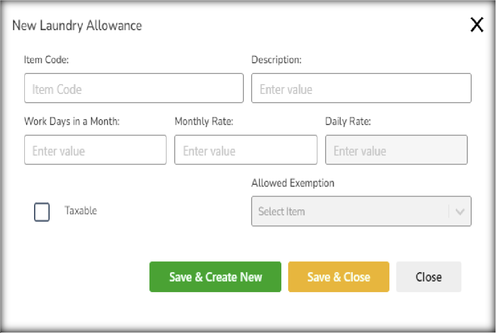 Buildup for Laundry Allowance. Note: Setup must be enabled in setup and options to view and create Laundry Allowance