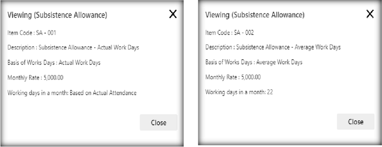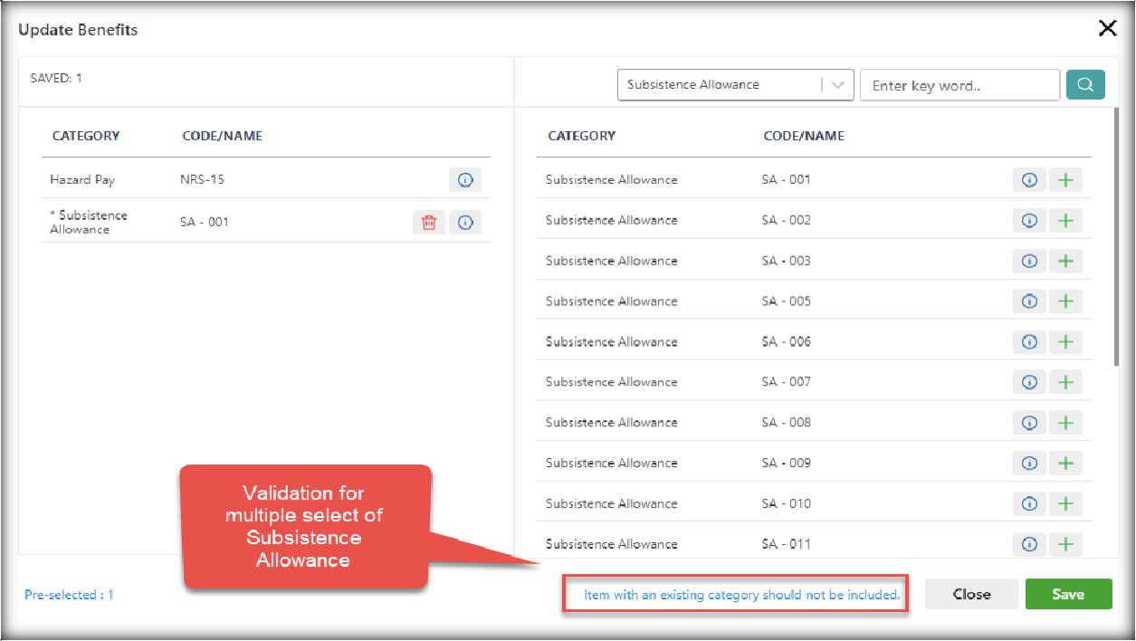 Note: Employee could only have 1 subsistence allowance. Validation will also appear if the user tries to assign multiple subsistence allowances.