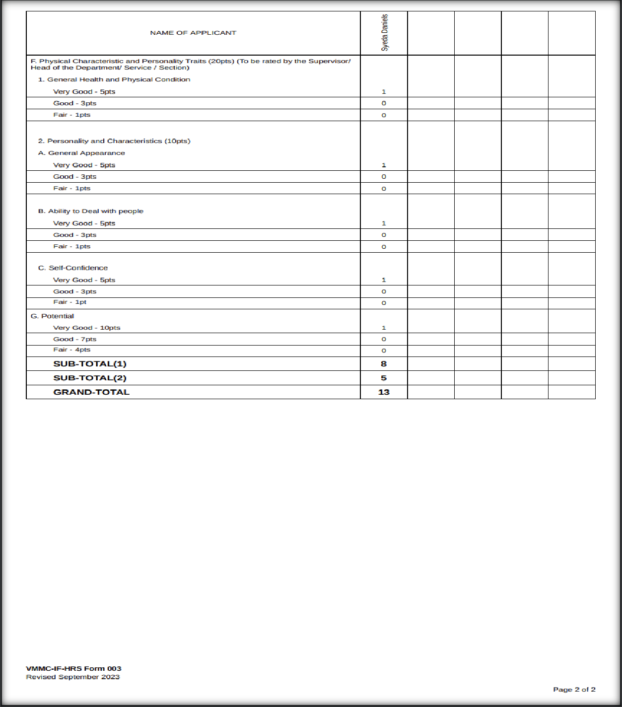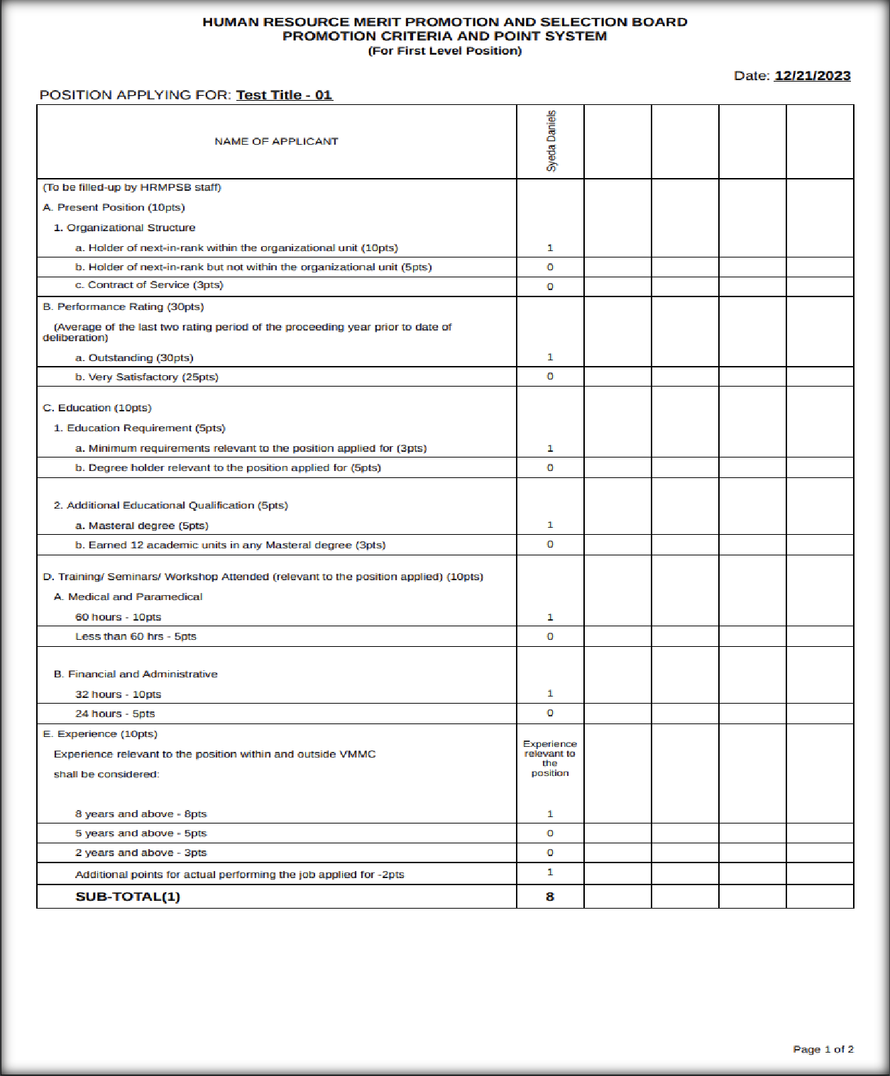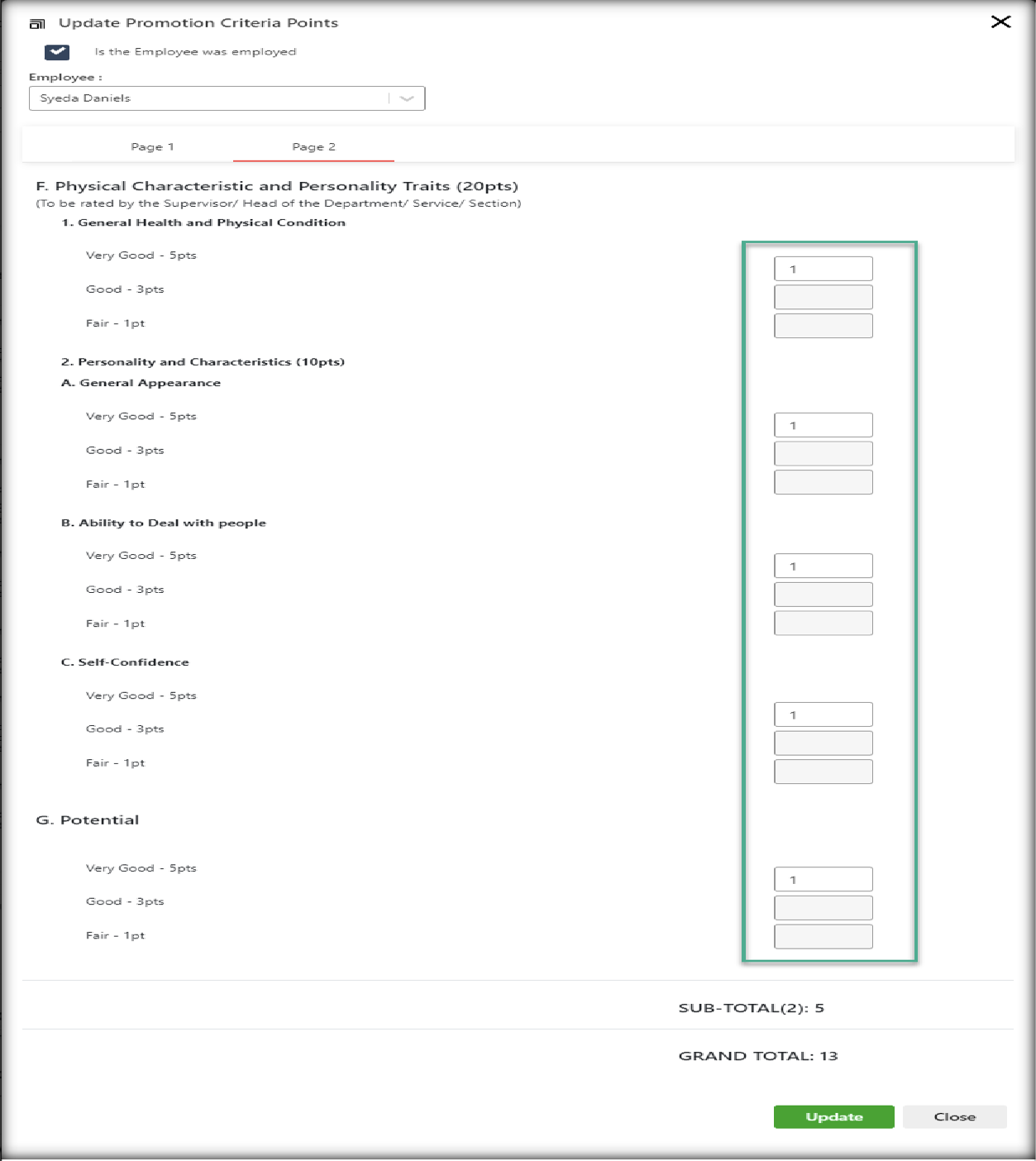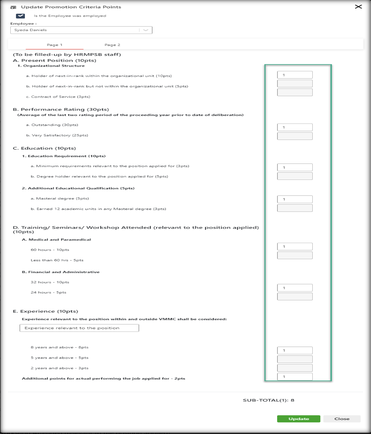 HR Forms — Promotion Criteria and Point System — Point System Enhancements Enhancement for pointing system of promotion criteria by applying text box in every row of giving points both page 1 and page 2. Note that in every group the other text box will disable once the text box has value.