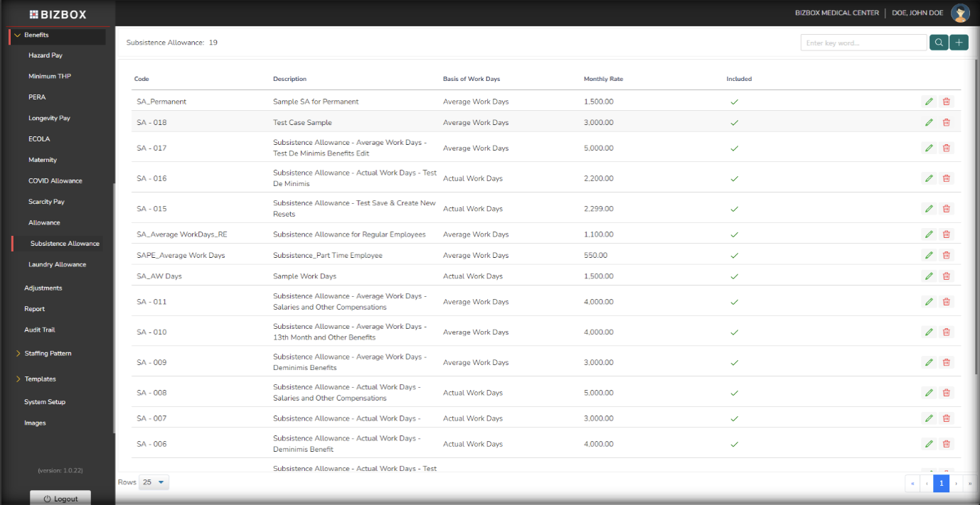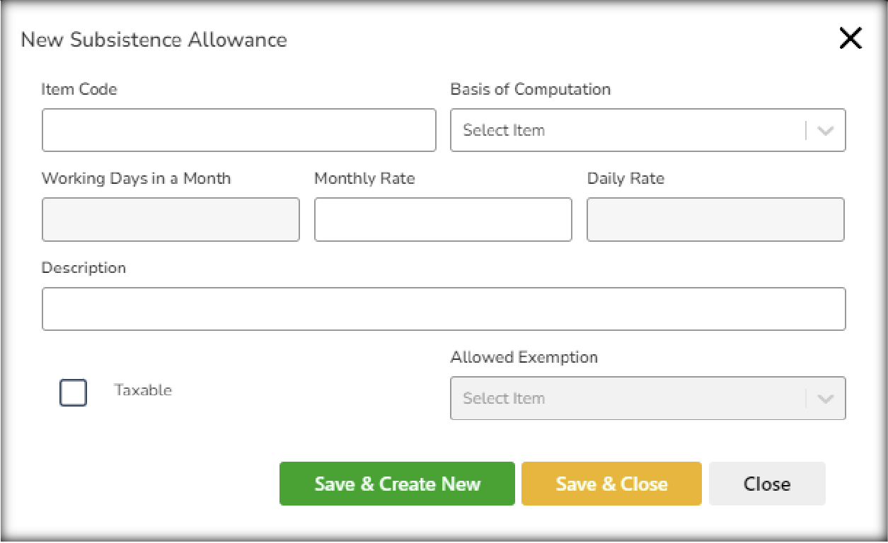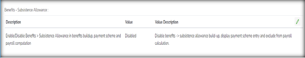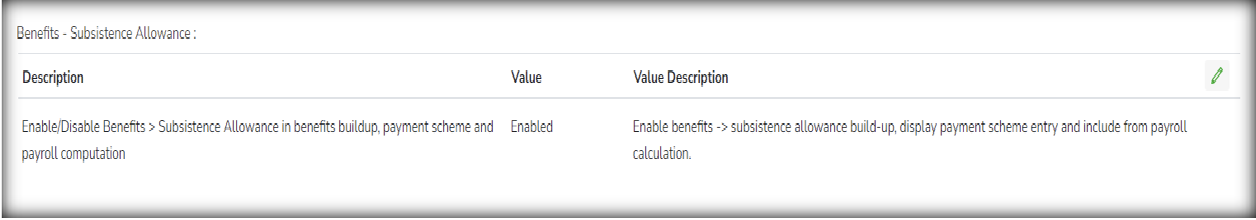 A new type of Payroll setup to enable Benefits > Subsistence Allowance