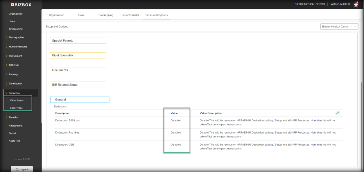 System Setup – Setup and Options – Enable/Disable Deductions
