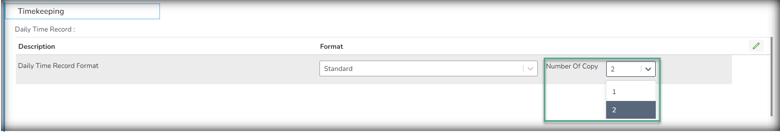 System Setup — Setup and Options — Timekeeping — Daily Time Record — Number of Copy